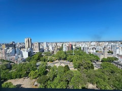 2 Ambientes ubicado en un piso 21, living comedor con salida al balcón a la calle con vista panorámica a la plaza San Martin, mar y sierras, pisos alfombrados, calefactor tiro balanceado, cocina separada con ventilación natural, , dormitorio con ventana con vista panorámica a plaza San Martin y a la Catedral, placard de 3 hojas con cajonera, baño completo con ventilación natural, Obra de gas realizada en el edificio y departamento.