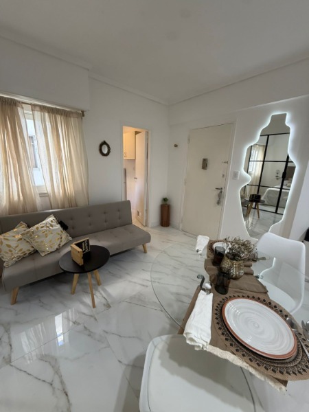 2 ambientes ubicado en un 7mo piso, living comedor con ventanal a la calle, calefactor tiro balanceado, cocina integrada con barra desayunadora, equipada con termotanque eléctrico, heladera con freezer, cocina, todo a estrenar, dormitorio con salida al balcón terraza a la calle, placard empotrado, baño con ducha y mampara, espacio para lavarropas. Amoblado y decorado Totalmente reciclado