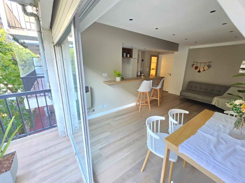 2 ambientes ubicado en un 1er piso, living comedor con salida al balcón corrido a la calle, cocina integrada con barra desayunadora, ventilación natural, conexión para lavarropas, dormitorio con ventana a la calle, placard a medida, baño con ducha con pediluvio y mampara. Aberturas en DVH, cortinados a medida, puertas premium nuevas con diseño, calefacción por tiro balanceado. Amoblado y decorado