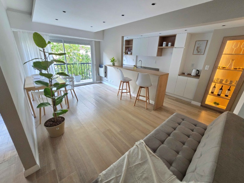 2 ambientes ubicado en un 1er piso, living comedor con salida al balcón corrido a la calle, cocina integrada con barra desayunadora, ventilación natural, conexión para lavarropas, dormitorio con ventana a la calle, placard a medida, baño con ducha con pediluvio y mampara. Aberturas en DVH, cortinados a medida, puertas premium nuevas con diseño, calefacción por tiro balanceado. Amoblado y decorado Totalmente reciclado